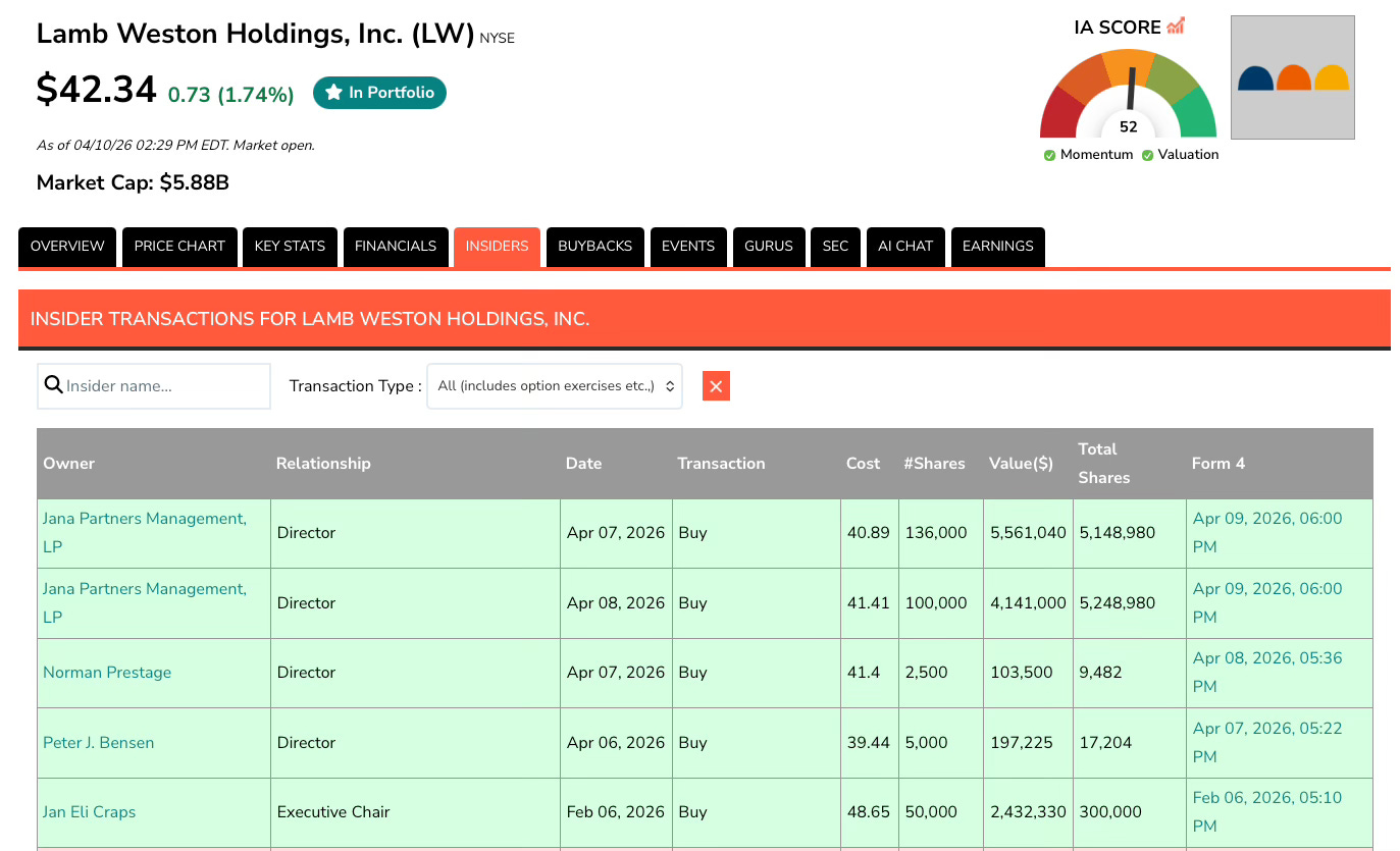 I was once again reminded of the Idaho-based potato products company Lamb Weston (LW) last night when we were looking at the latest crop of insider purchases. The activist investor Jana Partners added to their Lamb Weston stake to the tune of nearly $10 million. They were not the only insiders that were buying. Since the start of this year four different insiders have purchased shares including three this month.