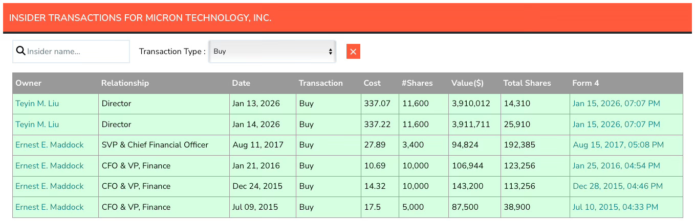 This is his first insider purchase of Micron since he joined the board in March 2025 and is also the first insider purchase of any kind at Micron in over eight years. The only other insider who purchased shares during the last fifteen years was Micron’s former CFO Ernest Maddock who picked up shares between 2015 and 2017 in a series of small transactions and then retired from the company in 2018.
