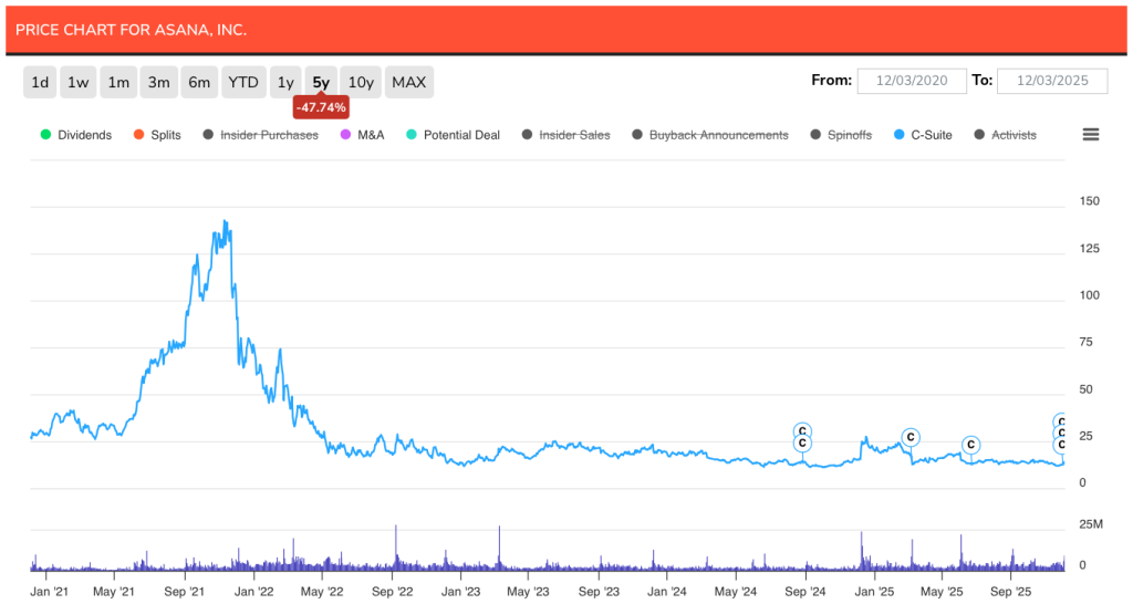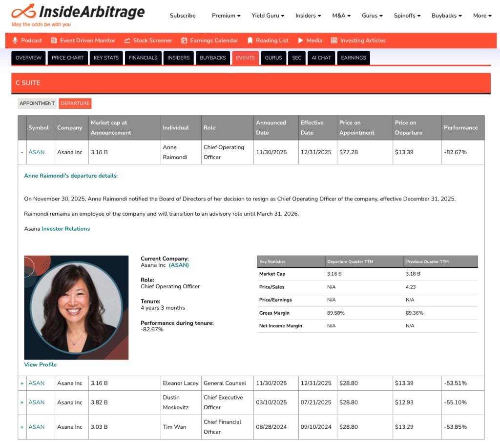 The management changes at Asana started with the appointment of new CFO Sonalee Parekh, which we covered in an article titled Asana: All Pain, No Gains in September 2024. This was followed by a string of additional C-Suite departures, including founder and CEO Dustin Moskovitz stepping down in July 2025 and two additional departures this week by their General Counsel Eleanor Lacey as well as their COO Anne Raimondi.
