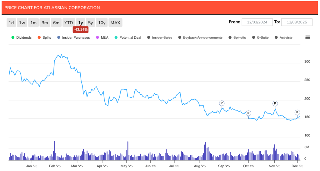 Going beyond M&A, a second event that jumped out when I was reviewing which company insiders were buying stock on the open market last night, was insider buying at Atlassian (TEAM). Most people who work in the tech industry are familiar with Atlassian’s products like Jira and Confluence.