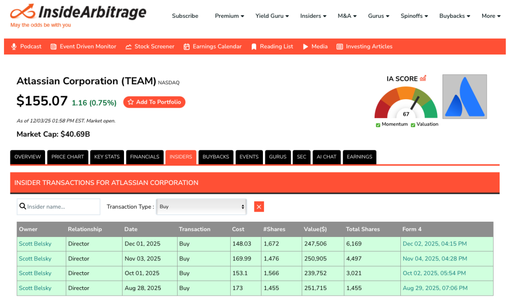 The insider purchase I saw was filed after-hours yesterday by Scott Belsky, a director of the company. This Atlassian purchase was his fourth purchase this year and he is the only insider at Atlassian who has purchased shares on the open market since the company went public nearly a decade ago.